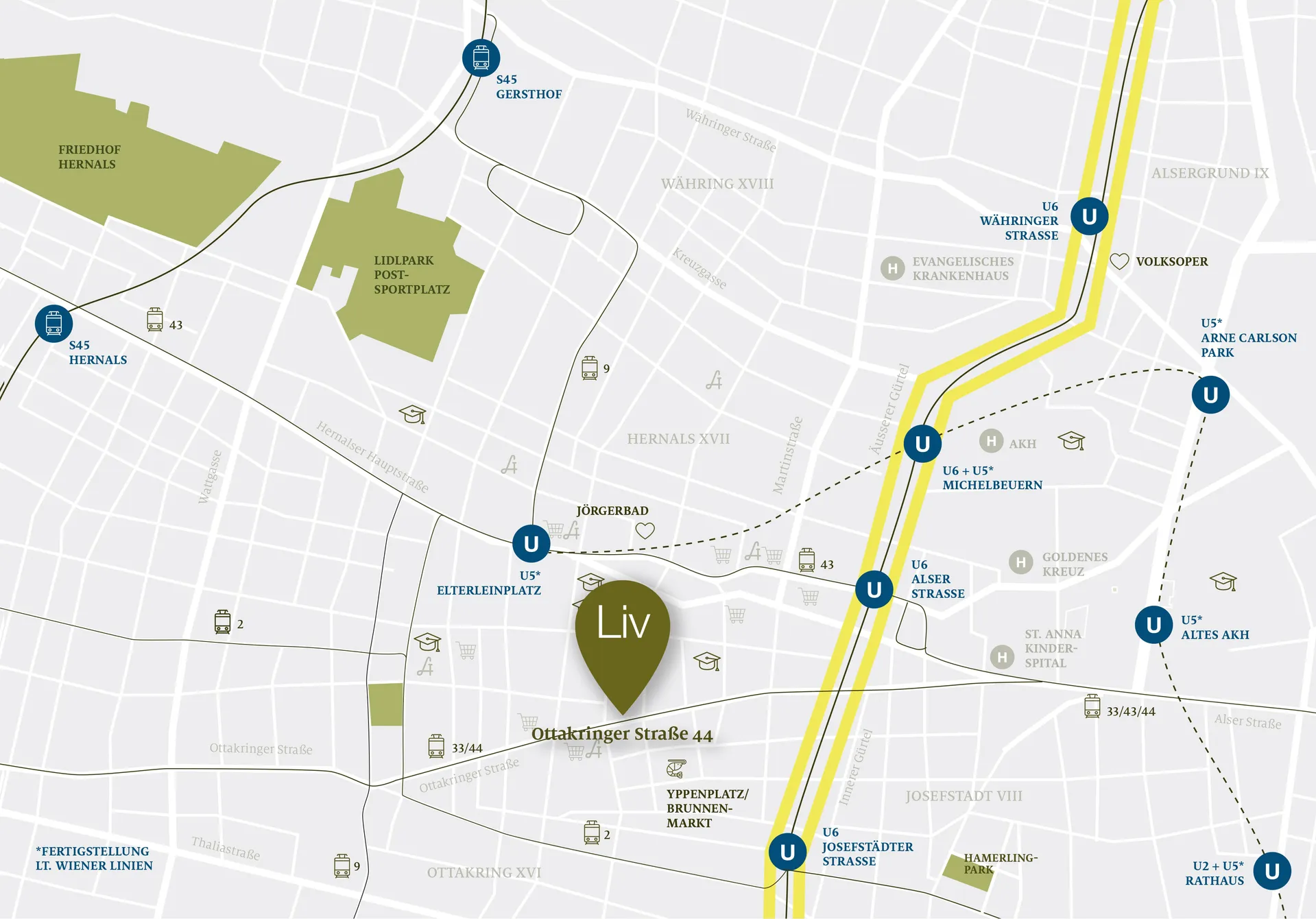 Urban und dennoch dörflich, individuell und trotzdem gemeinschaftlich, modern und gleichzeitig zeitlos. Wohnen in der Ottakringer Straße 44 ist all das und noch viel mehr. Das Neubauprojekt erfüllt alle Ansprüche an modernes und qualitätsvolles Wohnen in Wien. Oder vielmehr werden diese Erwartungen sogar übertroffen, wenn man sich die Penthousewohnungen mit den traumhaften Terrassenlandschaften ansieht. Jede Eigentumswohnung verfügt über eine attraktive Freifläche und die Grundrisse wurden bis ins kleinste Detail durchdacht. Im Erdgeschoß sowie im ersten Obergeschoß finden Büros und Ordinationen Platz. So wird das Projekt – wie auch die Gegend – bunt und lebendig.