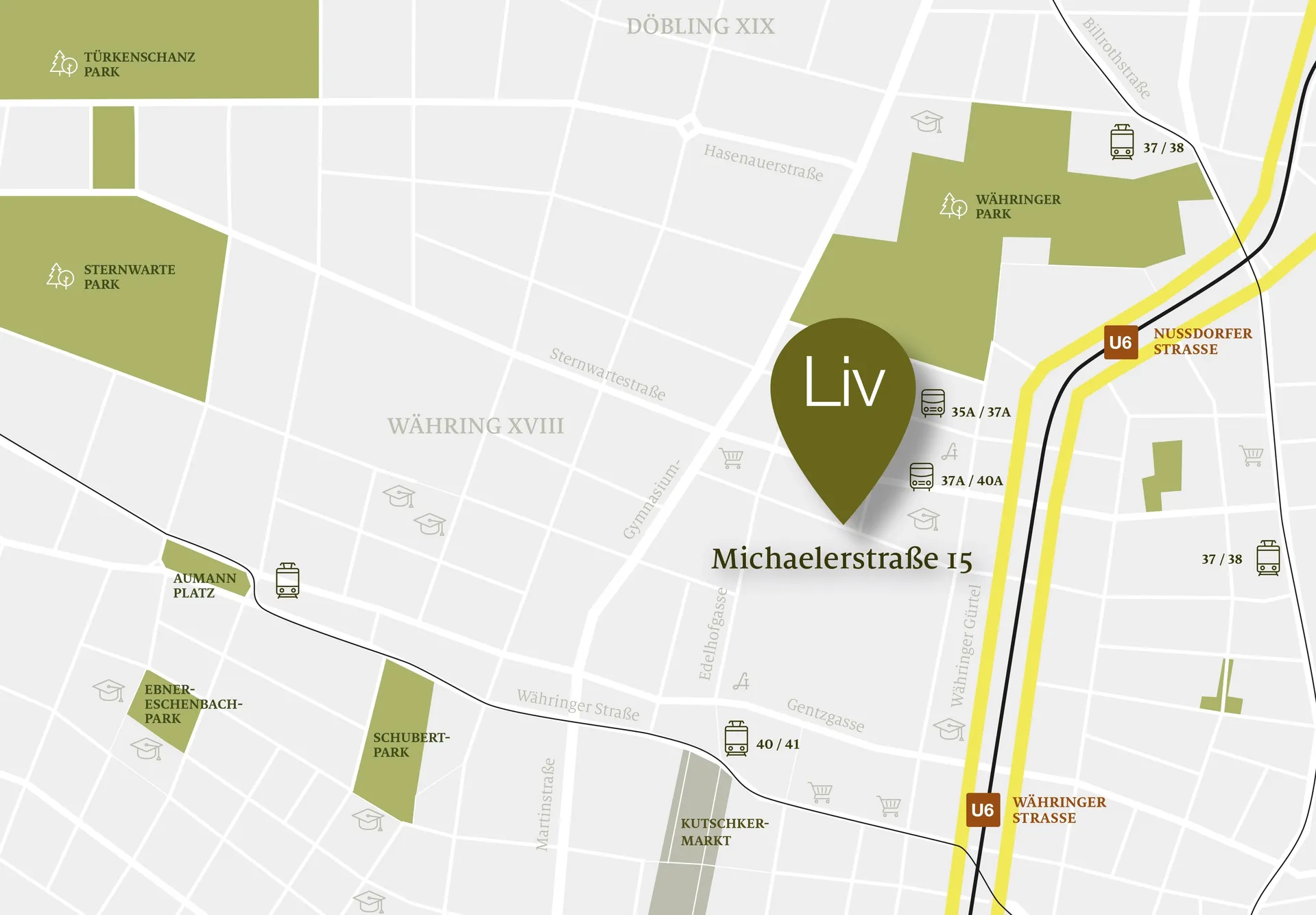ca. 6 Gehminuten zur U6-Station Währinger Straße-Volksoper; Straßenbahnlinien 40 und 41 für eine schnelle Verbindung ins Zentrum