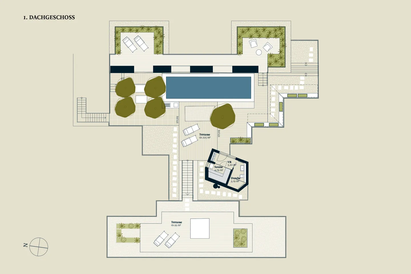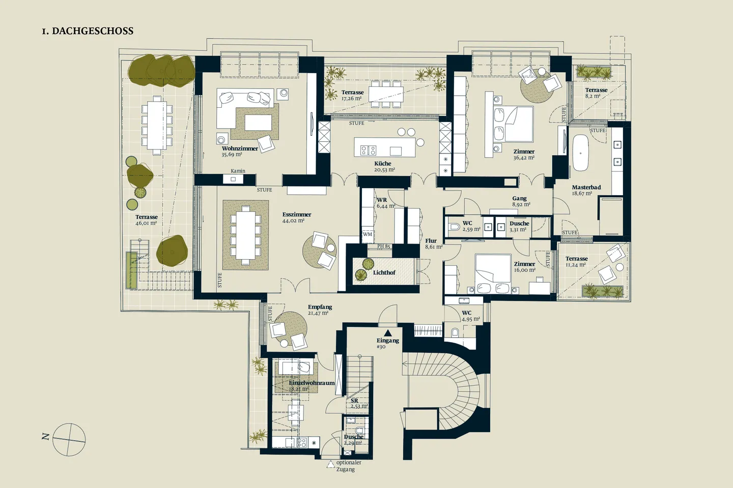Nahezu jeder Raum verfügt über einen direkten Zugang auf eine der insgesamt vier Terrassen, die sich auf Wohnebene befinden. Perfekte Präsentationsflächen für Ihre Kunstwerke, Fotosammlungen oder Bibliothek stellen die großzügigen, geraden Wände dar – eine echte Rariät bei Dachaufbauten. Ein wahres Spa-Erlebnis erfährt man auf der Dachterrasse, die spektakuläre Blicke in alle Himmelsrichtungen freigibt. Hier kann man im privaten Infinitypool oder in der eigenen Sauna-Cabin mit Blick auf die Piaristenkirche die Seele baumeln lassen.