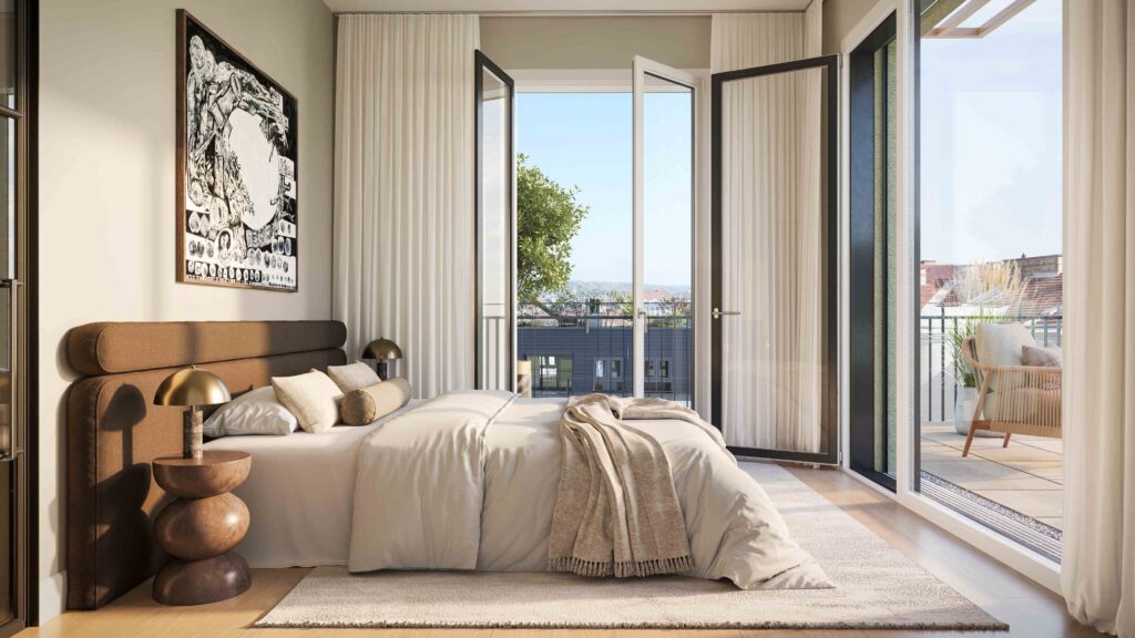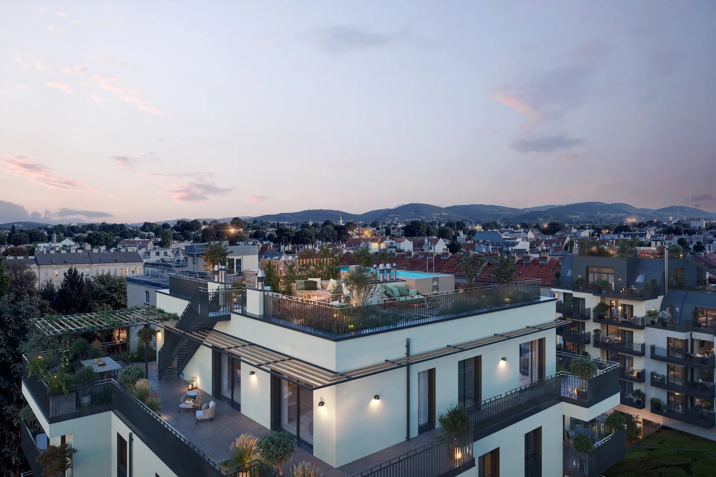 Auf der Straßenseite präsentiert sich der extrovertierte Bauteil MICHA als urbaner Freigeist: Loftartige Gewerbeflächen im Erdgeschoß, moderne, stilvolle Wohnungen in den oberen Etagen und ein Penthouse als markanter Abschluss. Hier schweifen die Augen durch die Baumreihen der Weitlofgasse bis hin zum Währinger Park – ein Ausblick, der den offenen, kommunikativen Charakter des Hauses unterstreicht.