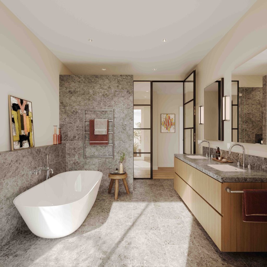 Im geschützten Innenhof befindet sich der Bauteil ELA – das ruhige Pendant. Zurückhaltend und harmonisch eingebettet ins Grün, bietet der Solitär großzügige Wohnungen mit Garten oder Terrasse und strahlt eine ruhige, geradezu meditative Atmosphäre aus.
