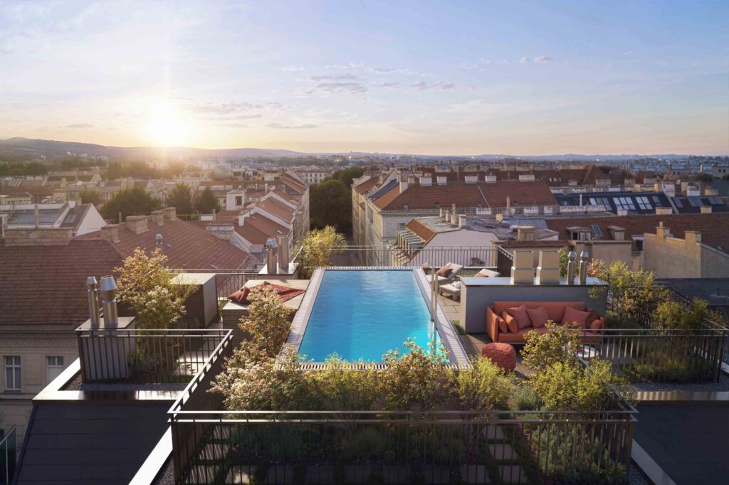 Auf den drei Ebenen – 5. Obergeschoss, 6. Obergeschoss und der großzügigen Dachterrasse – entfaltet sich ein Wohngefühl, das offene Gestaltung, Großzügigkeit und modernes Design vereint. Hochwertige Materialien, nachhaltige Geothermie zur Energieversorgung sowie der private Rooftop-Pool machen dieses Penthouse zu einem Zuhause für Menschen, die das Besondere suchen.